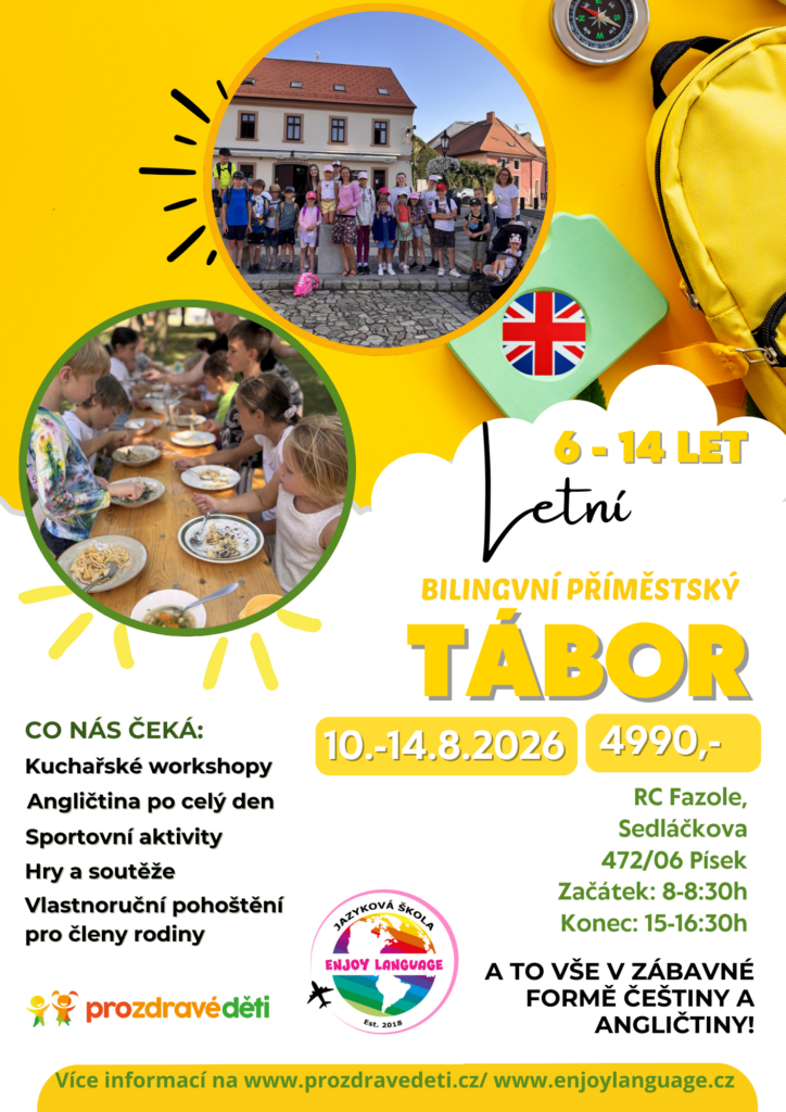 Opětovně pořádáme příměstský tábor ve spolupráci Enjoy Language a Pro zdravé děti! Dvojjazyčný příměstský tábor vedený v angličtině a češtině spojený s vařením a zábavou pro děti 🙂